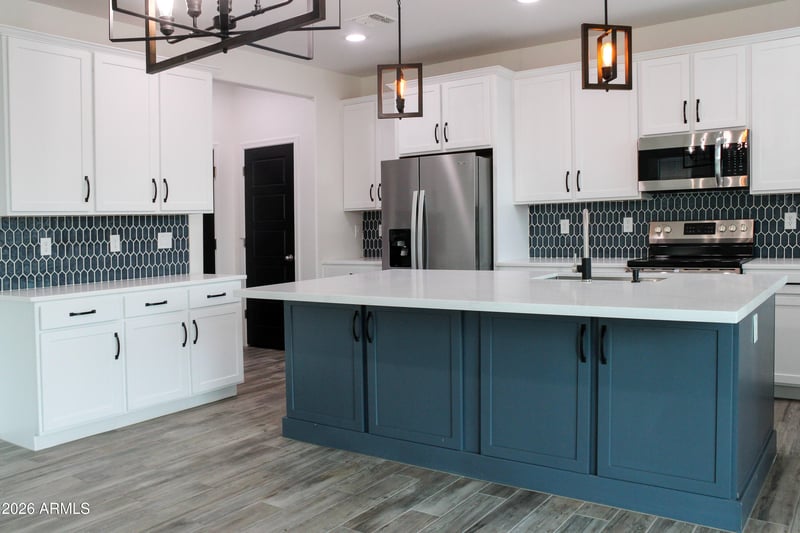 Listing details for 18519 Williams Rd, Surprise, AZ 85387 : Discover this exceptional 4 bedroom 3 bath home built in 2020 with OWNED SOLAR. From the moment you step inside, be greeted by a foyer that enters into the open concept layout that seamlessly connects the kitchen to living area. You'll feel a stylish ambiance throughout the home! Kitchen boasts both style & functionality in mind, large center island, plenty of cabinet space, black hardware and modern fixtures. Downstairs you will see contemporary tile in the wet areas. A full bathroom and bedroom that can serve as a mother in law suite or guests. Master Suite is private from the rest of the rooms. Features custom cabinets with double sinks, walk in shower & a large closet. Loft that can be a den or 5th bedroom. Backyard has built in kitchen, turf and pergola.