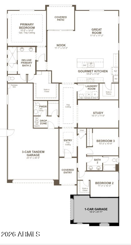 Listing details for 18543 Laurie Ln, Waddell, AZ 85355 : Discover this stunning Celeste home, situated on a desirable homesite boasting driveway pavers and front yard landscaping. Included features: an inviting covered entry; an expansive great room; a gourmet kitchen offering 42'' cabinets, quartz countertops, a waterfall island and a walk-in pantry; a roomy nook; a quiet study; a beautiful primary suite showcasing an immense walk-in closet and a deluxe bath with double sinks; a convenient laundry; a drop zone and a covered patio. This home also offers stone tile flooring and ceiling fan prewiring in select rooms.