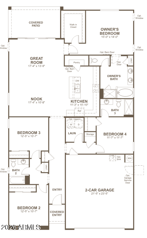 Listing details for 18566 Helian Dr, Gold Canyon, AZ 85118 : The Slate floorplan offers a desirable split and open-concept layout with 4 bedrooms, 3 bathrooms, and a 2-car garage (21.5 x 23 ft). Designed for both privacy and functionality, the fourth bedroom includes a walk-in closet and a private ensuite bath with a walk-in shower, ideal for guests or multigenerational living.