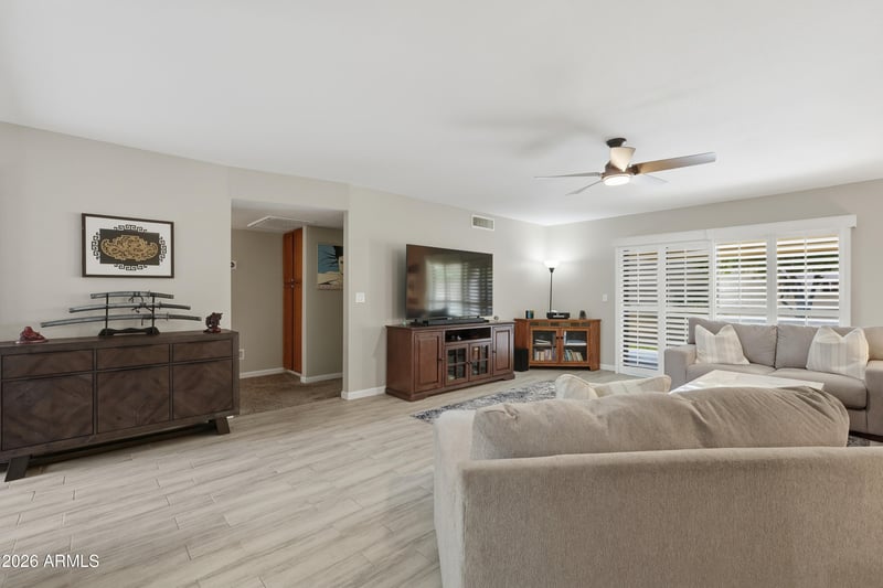 Listing details for 18622 94th Ave, Peoria, AZ 85382 : You won't be disappointed when you see this beautiful, recent remodel with pool view that features a spacious kitchen with granite countertops and tile backsplash, matching stainless steel appliances, white cabinets, R/O system, and upgraded kitchen sink. Spacious primary suite features a shiplap accent wall in white and a fully remodeled bathroom complete with granite countertops, tiled walk-in shower, and walk-in closet with a modern barn door. Other upgrades include new HVAC w/Nest thermostat in 2025, plantation shutters throughout, custom tile floors, lights, fans, fixtures, baseboards, raised counters, and toilets. There is a covered patio off the large living area along with a smaller patio off the master suite featuring a view of the pool within walking distance. Other features include a newer garage door opener, sunscreens, and garage cabinets. Beautifully maintained community with an abundance of green grass, amenities, and golf. Close to the 101 freeway and lots of shopping at Arrowhead!