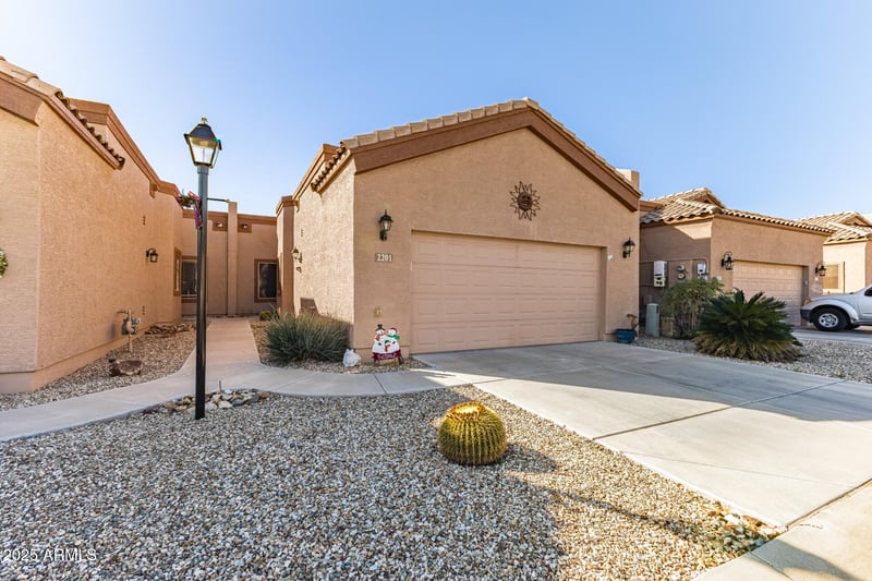 Listing details for 18650 91st Ave #2201, Peoria, AZ 85382 : Check out this beautiful 3 bed, 2 bath townhome, now for sale in West Creek Villas! This is a 45+ gated community with a clubhouse and community pool. Featuring charming curb appeal, a low-maintenance front yard, and a 2 car garage. Inside you will find the third bedroom was converted into a bonus room, along with vaulted ceilings, fireplace, and new luxury vinyl plank flooring throughout the house. The kitchen comes equipped w/ample cabinetry, brand new stainless steel kitchen appliances, and a serving window with a breakfast bar. The primary bedroom has a walk-in closet and a private ensuite w/dual sinks and full shower remodel. Also including a quaint backyard w/a covered patio and extended paver seating area. New air conditioning unit and new hot water heater installed in 2025.