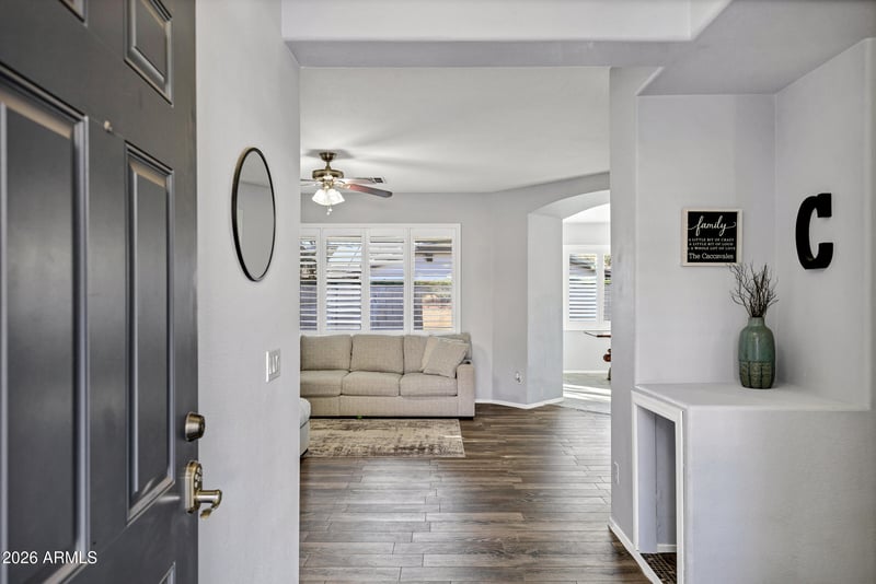 Listing details for 18703 Pelican Ct, Queen Creek, AZ 85142 : Welcome home to this beautifully maintained single-story 4 bed, 2 bath home in the highly desirable Cortina community of Queen Creek. Offering 1,637 sq ft with a smart split floor plan, this home is perfect for families or first-time buyers. Enjoy a cozy family room that opens to the kitchen, hardwood-style tile floors throughout, trendy neutral paint, and white shutters for a clean, modern look. The primary suite features a walk-in closet and private bath. Outside, relax under the covered patio and enjoy low-maintenance artificial turf and desert landscaping. Located on a quiet, kid-friendly street with no neighbors facing, close to top-rated schools, parks, shopping, and a community pool. Clean, comfortable, and perfect location—this one checks every box.