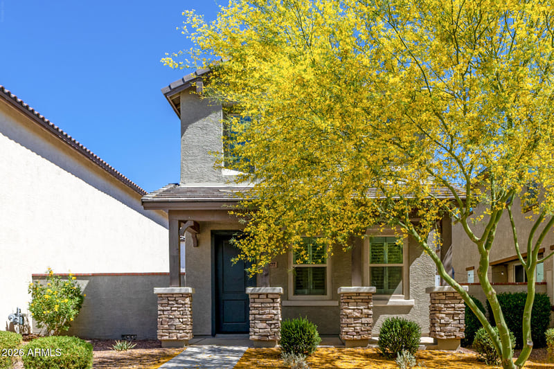 Listing details for 1877 Marketside Ave, Buckeye, AZ 85396 : You'll love this charming two-story home in Verrado! Providing 3 beds, 2 baths + powder room, & a rear 2-car garage. The full-length front porch is just the beginning. The inviting interior features tons of natural light, neutral palette, recessed lighting, wood-look tile flooring downstairs, and soft carpet upstairs. You'll love the spacious great room paired with multi-sliding doors merging the inside/outside activities! The impressive eat-in kitchen boasts SS appliances, tile backsplash, white shaker cabinetry, a walk-in pantry, and a peninsula w/breakfast bar. All bedrooms are upstairs, along with a versatile loft! Large main bedroom has two walk-in closets & an ensuite w/dual sinks. Outback, you have a covered patio, extended pavers, & artificial turf. Plus SOLAR PANELS! Welcome home!