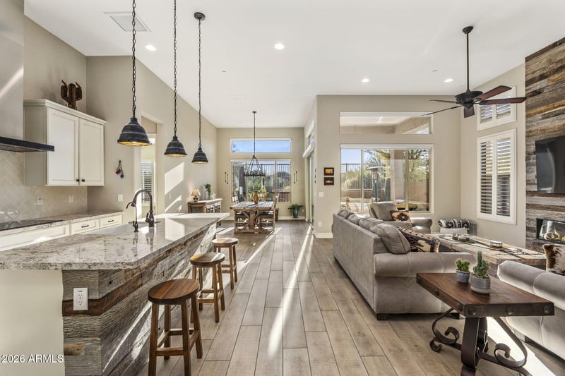 Listing details for 18785 Blue Sky Dr, Rio Verde, AZ 85263 : Enjoy the exceptional amenities of Tonto Verde Golf Club from this beautiful lock-and-leave home, ideally located on the third hole of the Ranch Course. Situated within a gated 55+ community, residents enjoy pickleball, a dog park, on-site dining, a pool and spa, an 18-hole putting green, a business center, and scenic walking trails. As the largest model in the community, this six-year-old home features numerous upgrades, including new travertine in the backyard, new appliances, custom shades, primary closet organizers, tall baseboards, 42-inch cabinetry, granite countertops, tile bathrooms, and soaring ceilings—offering both comfort and style in a truly low-maintenance setting.