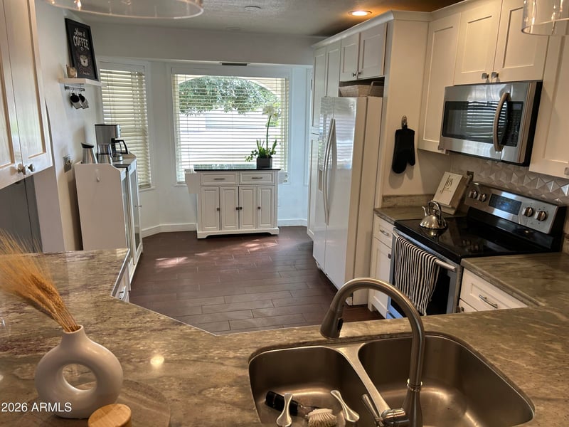 Listing details for 18802 36th Pl, Phoenix, AZ 85050 : What an awesome home three bedrooms two nicely appointed baths, updated kitchen with granite counter tops, white shaker cabinets and stainless steel appliances. Cozy fireplace in the living room and another on a private patio off one of the bedrooms. Dual pane windows two HVAC units for efficient use of power. Great schools near by, roof underlayment in approx. 2018.Covered patio, gassy yard perfectly sized even an evap cooled storage shed. All this on a corner lot in an upscale well cared for neighborhood without HOA fees!