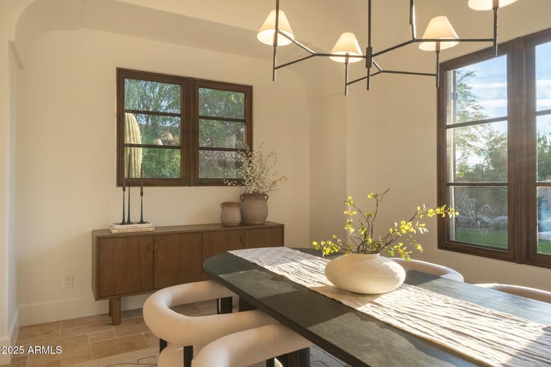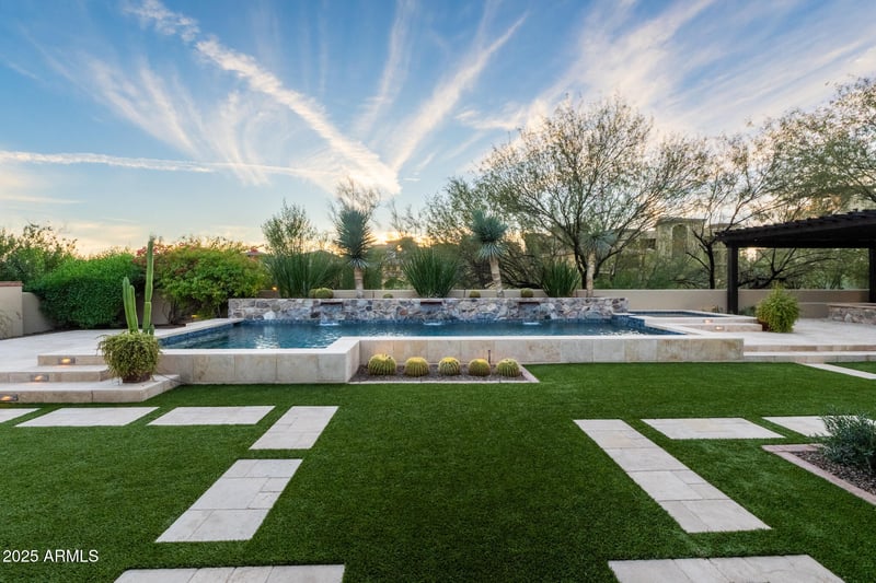 Listing details for 18826 101st Pl, Scottsdale, AZ 85255 : Located in one of Silverleafs most sought-after guard-gated enclaves, this single-level residence blends timeless architecture with effortless indoor-outdoor living. A rose-lined front courtyard framed by mountain views creates a composed sense of arrival. Custom steel and glass casement doors open to a light-filled great room with clerestory windows and expansive walls of glass that extend to a deep covered patio anchored by a floor-to-ceiling fireplace. Outdoor living continues at a BBQ ramada and spa-side fire pit designed for relaxed entertaining. The kitchen is thoughtfully appointed with a scullery and an adjacent, fully equipped bar. Three ensuite bedrooms, a private office offer quiet retreat, complemented by a heated pool and spa, with walkable access to the Silverleaf Clubhouse.