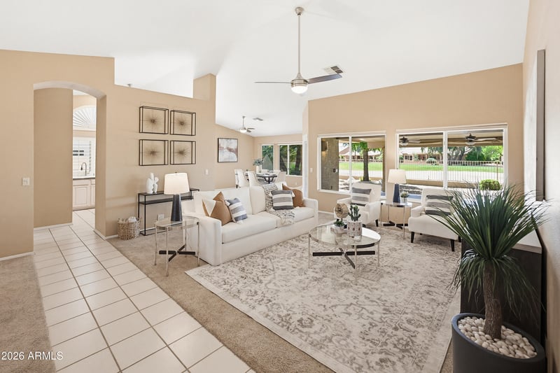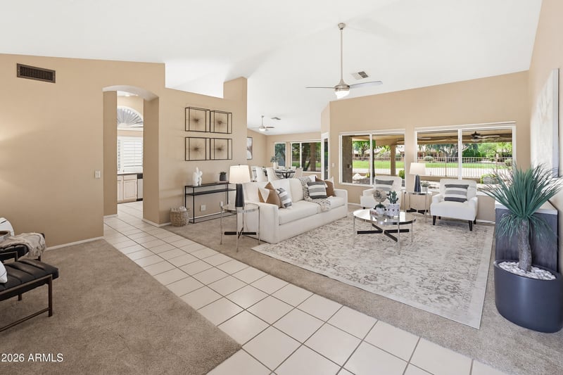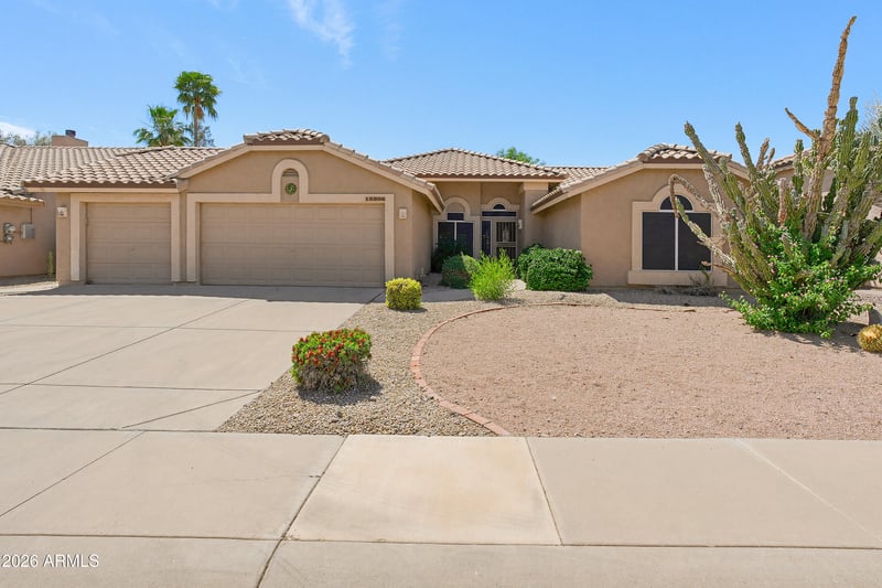 Listing details for 18906 88th Dr, Peoria, AZ 85382 : Experience relaxed Arizona living in the highly desirable golf course community of Westbrook Village, ideally positioned on the Vistas 8th tee box with beautiful golf course views from nearly every room. Step inside to a spacious great room with vaulted ceilings, abundant natural light, classic wood shutters, and ceiling fans throughout for added comfort. The kitchen features stainless steel appliances and opens to a large dining area ideal for everyday living and entertaining. The flexible floor plan includes 3 bedrooms plus a bonus room perfect for an office or crafts. The primary suite offers a bay window overlooking the patio and golf course along with a dual-sink vanity in the ensuite bath. Step outside to an extended covered patio with a built-in BBQ, creating the perfect space to relax and enjoy the scenic surroundings. Additional highlights include a 3-car garage with built-in cabinets for excellent storage. Located within Westbrook Village, offering access to golf, clubhouse amenities, pools, activities, and a vibrant community lifestyle.