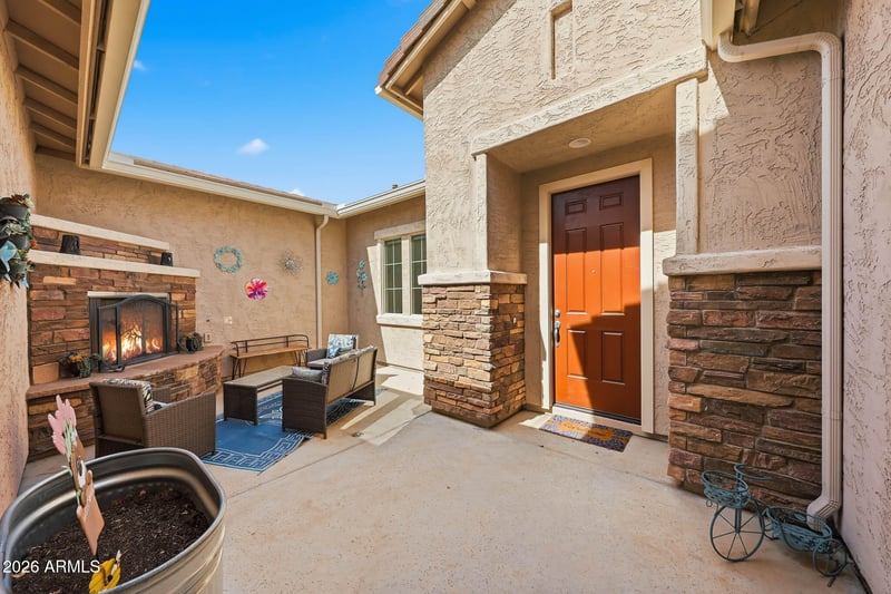 Listing details for 18932 Windsor Blvd, Litchfield Park, AZ 85340 : Beautifully appointed single-story home in the desirable Windrose community, featuring newer construction and nearby views of the White Tank mountains. This thoughtfully designed residence offers 4 bedrooms plus an office and 3.5 bathrooms. Step outside to a private backyard with covered patio and self-cleaning PebbleTec pool including a custom Katchakid pool cover. The lot is positioned with North/South exposure, while neighboring single-story homes border the backyard to offer ultimate privacy. A front gated courtyard with built-in fireplace creates an inviting entry, and a 3-car garage completes the home. A wonderful opportunity to own a well-appointed home in sought-after Litchfield Park. Inside, enjoy tray ceilings along with a spacious open kitchen featuring granite countertops, gas cooktop, oversized island, and walk-in pantry. One secondary bedroom is privately situated at the front and includes its own en-suite bathroom, ideal for hosting guests. Custom flooring in three of the bedrooms and the den adds a contemporary touch. The primary suite features an oversized walk-in shower, large separate dual vanities, and soaking tub. The primary bedroom and two of the secondary bedrooms offer walk-in closets. Enjoy the benefits of solar without the upfront cost as this home features an owned solar system with assumable financing, offering lower monthly energy expenses.