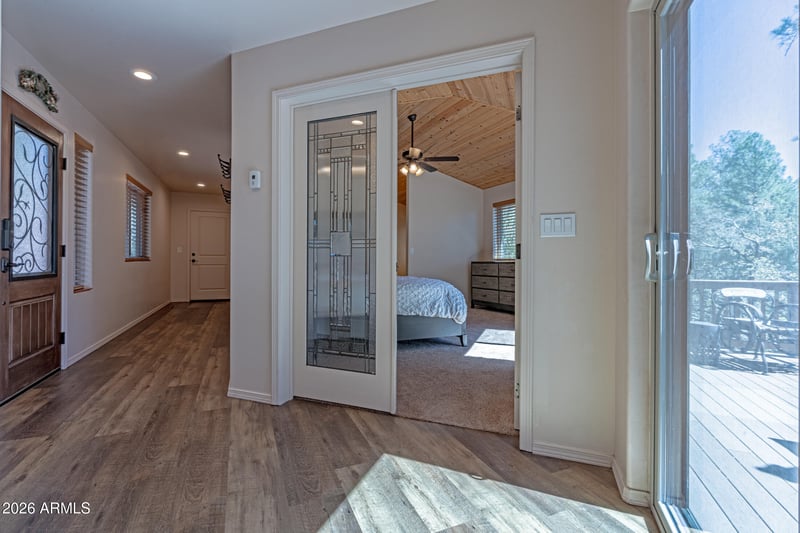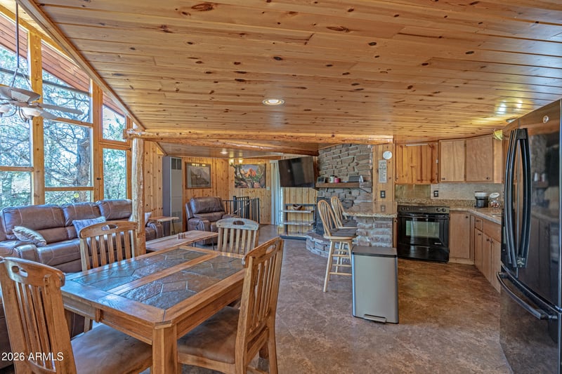 Listing details for 190 Greystone Cir, Payson, AZ 85541 : You'll love this updated mountain retreat on a quiet circle in Ponderosa Springs, surrounded by the Tonto National Forest and minutes from the Rim. The original log-sided cabin blends with a 2016 addition featuring a stunning great room with vaulted ceilings, floor-to-ceiling windows, and incredible views, plus knotty pine accents, stone fireplace, and remodeled kitchen with granite. Flexible layout includes a loft bedroom or office, updated main bath, and lower level with separate entrance ideal as a third bedroom or game room. The addition offers a private master suite with walk-in closet and laundry. Enjoy a wraparound deck, stone patio, fenced yard, sheds, and attached garage, perfect for hiking, ATV trails, and outdoor living.