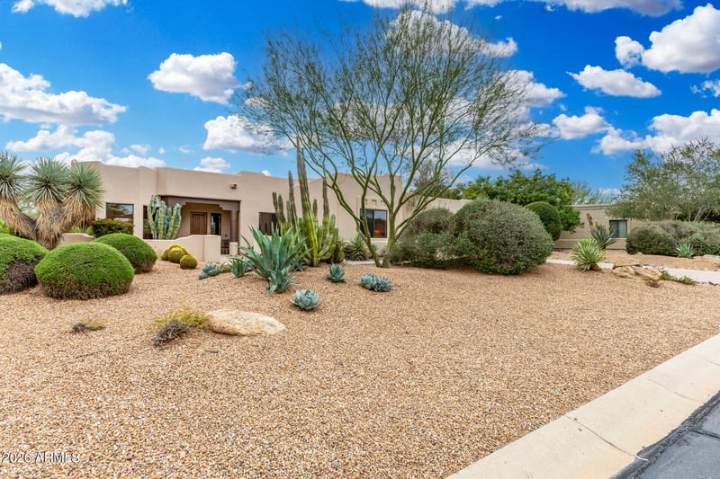 Listing details for 19023 Box Bar Trl, Rio Verde, AZ 85263 : Discover the allure of this exquisite 2-bedroom + office territorial-style home with a 2.5-car garage & timeless curb appeal. Inside, sleek tile floors guide you into a welcoming living room adorned with elegant wall niches and a cozy gas fireplace perfect for relaxing evenings. Enjoy intimate dinners in the formal dining area, then gather in the beautifully appointed kitchen featuring rich wood cabinetry, granite counters, tile backsplash, wall ovens, essential appliances, a center island, breakfast bar, and a sunny breakfast nook. The serene primary suite offers direct backyard access and a private bath with dual sinks, a soaking tub, and a spacious walk-in closet. A versatile den makes an ideal office or creative space, while the laundry room includes a convenient utility sink... Outdoors, unwind under the covered patio surrounded by desert plantings in the sizable backyard. This dream home is ready to inspire lasting memories! Don't miss out!