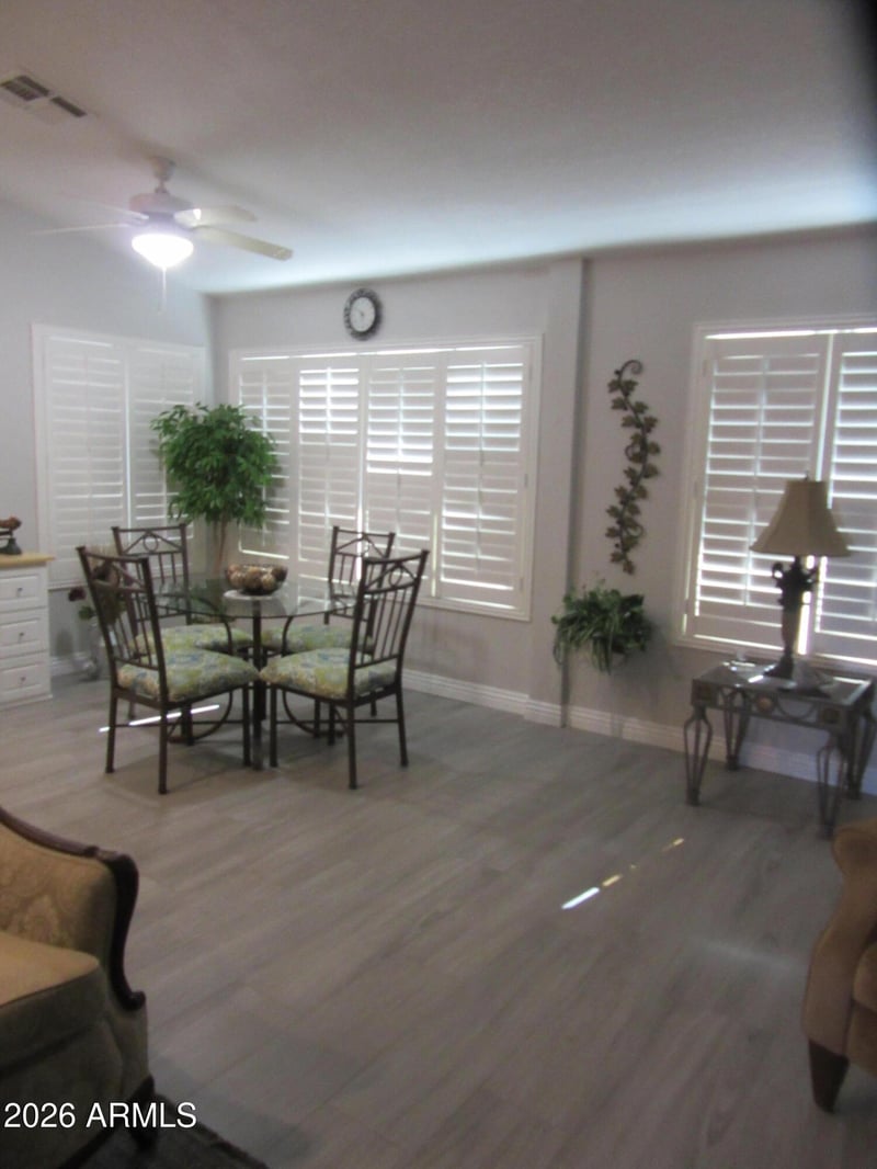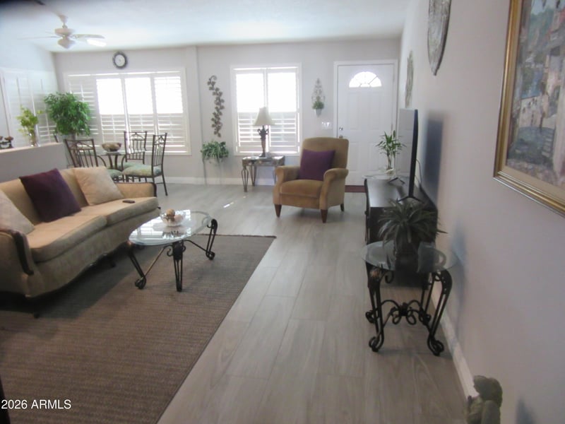 Listing details for 1903 Colonial Dr, Chandler, AZ 85249 : Updated and extended beautiful Popular Carmel Model. New Floor Tile that looks like wood planks, in all rooms. No popcorn ceiling, Kitchen cupboard are white and there is Granite counter tops. Additional cupboard in Kitchen area. recessed Ceiling lights in kitchen. White Plantation shutters in Living Room and Master Bedroom. Walk-in master closet. Private back area with gate that leads to walking path in the back of home. Front Patio. Dual Pane Windows. Newer A/C only couple of years old. Ceiling Fans Storage Cabinets in Garage.