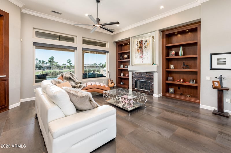 Listing details for 19117 Moondance Ln, Surprise, AZ 85387 : Sophisticated golf course living defines this beautifully reimagined 3,411 sq ft Windsor model overlooking Cimarron Golf Course in The Grand. A striking steel entry door opens to soaring 12' ceilings, new UV-rated windows, and remote window shades throughout. The expansive primary suite features an electric fireplace, dual California walk-in closets, and a spa-inspired bath with freestanding clawfoot tub, dual vanities, and oversized shower. The gourmet kitchen offers quartz surfaces, stainless steel appliances, gas cooking, and a walk-in pantry, flowing seamlessly into elegant living spaces designed for entertaining. A steel patio door opens to a resort-style backyard with pool, spa, built-in BBQ, gas fireplace, expansive covered patio, and sweeping golf course views.