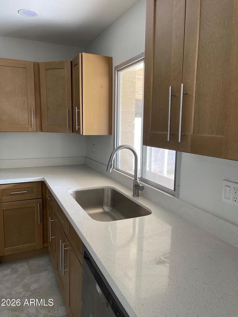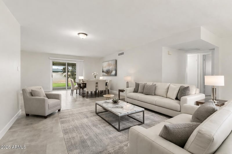 Listing details for 1915 Gemini Dr, Tempe, AZ 85283 : Newly remodeled 4 bed, 2 bath 1-story home with a 2-car garage, designed for modern upscale living. Features tile flooring throughout, brand new kitchen cabinetry, quartz countertops, updated bath vanities, fresh paint, and new A/C. Open-concept layout flows seamlessly from living and kitchen spaces to a full-width covered patio, ideal for indoor-outdoor entertaining. Private en suite primary bedroom, ceiling fans in every room, pantry, and ample storage including a garage utility room. The patio overlooks a grass backyard with mature fruit trees. EV charger in garage. Convenient access to the 60, 101, and 202 freeways, Tempe Marketplace, Optimist Park, and top-rated schools.