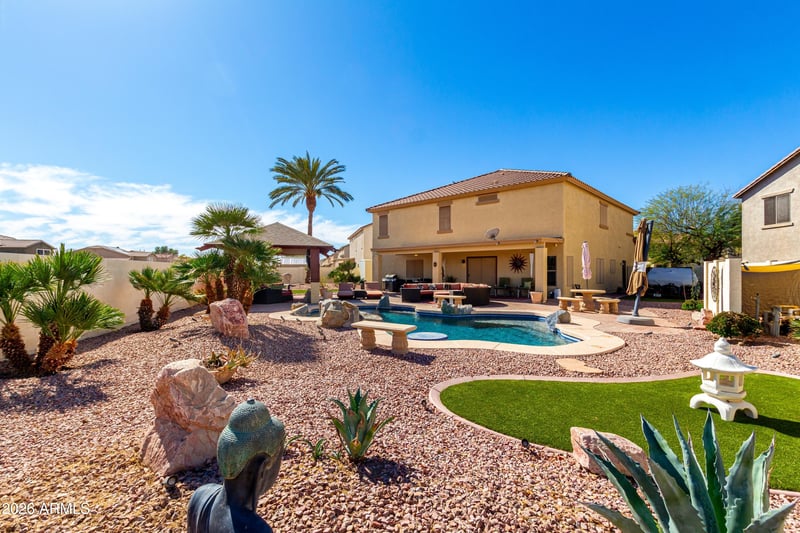 The resort-style backyard features a covered patio, extended paver seating with a gazebo, artificial turf, a storage shed, and a sparkling pool with water feature.