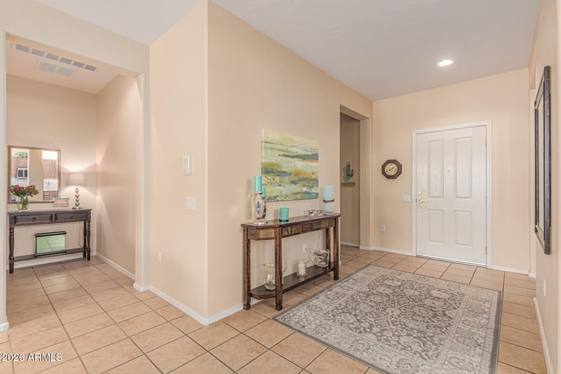 Listing details for 19232 Moondance Ln, Surprise, AZ 85387 : Discover easy, elegant living in the active adult community of Sun City Grand! This beautifully maintained turnkey Azalea model offers 2 bedrooms plus a den, 2 baths, an extended 2 car garage with built in cabinetry. Inside, enjoy abundant natural light, a neutral palette, and tile flooring with carpet in all the right places. The open concept layout flows effortlessly, ideal for everyday living and entertaining. The kitchen features stainless steel appliances, quartz countertops, subway tile backsplash, under-cabinet lighting, and a breakfast bar. The den is perfect for a home office. Both bedrooms include bay windows, and the primary suite offers an ensuite bath with a walk in closet. Step outside to an extended covered patio for relaxing or BBQs, and enjoy the community amenities.