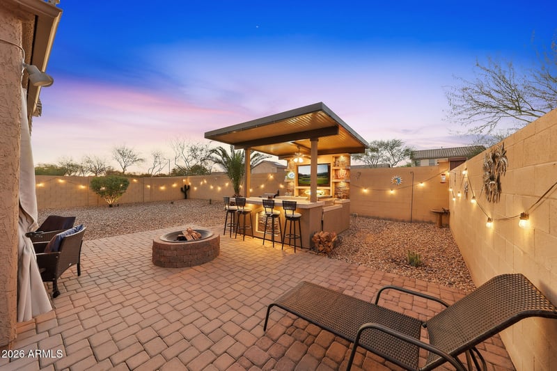 Step outside and experience your own private Arizona oasis. Designed for both relaxation and entertaining, the backyard features a covered patio with extended pavers, cooling misters, a cozy firepit, and an above-ground spa - perfect for enjoying beautiful desert evenings. The standout feature is the separate covered outdoor kitchen, complete with a built-in BBQ, bar seating, TV, and misters, creating the ultimate space for hosting unforgettable gatherings or enjoying game days under the open sky.