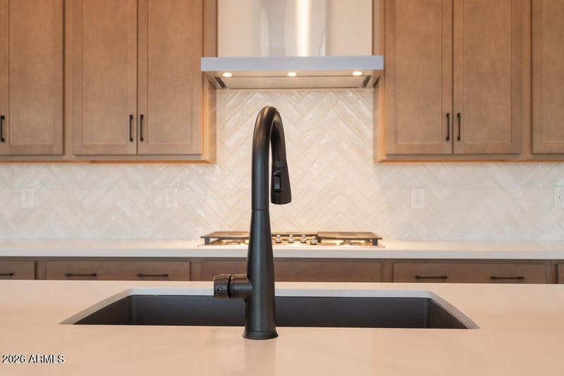 Listing details for 1928 Empeltre Rd, San Tan Valley, AZ 85140 : Discover this expansive two-story Tri Pointe Homes residence offering 3,973 sq ft, 5 Bedrooms and 3.5 Baths in a sought-after amenity-rich community. Designed for both comfort and style, the open-concept layout features a beautifully appointed Kitchen with Benton Birch Quill shaker cabinetry, soft-close doors, quartz countertops, boxed-in refrigerator, 36'' gas cooktop with hood, built-in microwave and double oven, matte black Delta faucet and Blanco single-bowl sink. Enjoy a luxurious Primary Bath with separate tub and shower. Tile flooring extends throughout main living areas, with added conveniences including laundry sink rough-in and soft water loop pre-plumb.