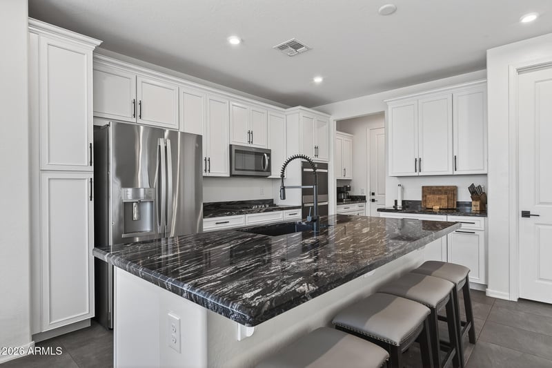 Listing details for 19322 Valle Vista Way, Litchfield Park, AZ 85340 : Located on an expansive homesite, this beautifully maintained original-owner home features 5 bedrooms plus a den with double doors and 4.5 baths across 3186 SqFt. A main-level bedroom with en-suite bath offers ideal guest privacy. The gourmet kitchen flows into the great room and showcases white soft-close cabinetry, granite counters, a gas cooktop with double ovens, a butler's pantry, a large walk-in pantry, and an island with breakfast bar. Upstairs, the primary suite includes dual vanities, an oversized tiled rain shower, and a walk-in closet. Two bedrooms share a Jack & Jill bath, while another enjoys its own en-suite. A loft and spacious laundry room complete the upper level. Additional highlights include a soft water loop, 3-car tandem garage with service door, and RV gate.