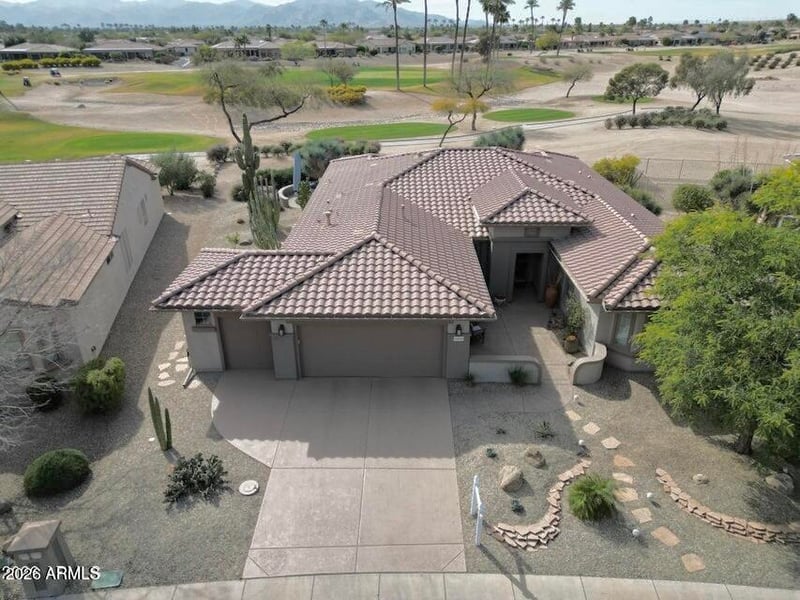 Listing details for 19426 Coronado Ridge Dr, Surprise, AZ 85387 : One of the BEST lots in The Grand, this 3-bed, 2.5-bath Mission model overlooks the spectacular double greens on the 11th and 7th holes of Cimarron golf course. This stunning property welcomes you with a 2-car garage + golf cart garage, and an inviting courtyard. The tranquil living room boasts high ceilings, recessed lighting, and tile flooring. Culinary adventures await in the eat-in kitchen, featuring granite counters with a matching backsplash, abundant wood cabinetry with crown molding, stainless steel appliances and a cozy breakfast bar. The primary suite showcases classic plantation shutters, a sitting nook, backyard access, a bathroom with dual sinks, and a walk-in closet. Enjoy enchanting sunsets from the backyard, which offers a spacious patio with retractable awning.