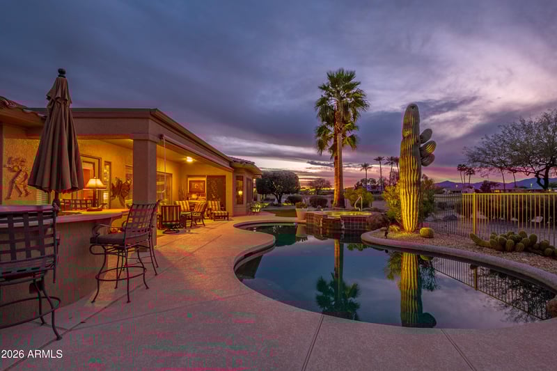 Listing details for 19450 Coronado Ridge Dr, Surprise, AZ 85387 : AS YOU ENTER THIS BEAUTIFUL ASHBURY THE SENSATIONAL VIEWS OF THE FULL FAIRWAY,MOUNTAINS & THE GREEN IS WOW! THE SUNSETS OVER THE MOUNTAINS ARE BREATH TAKING!! THIS HOME HAS IT ALL! NEUTRAL TILE & CARPET IN ALL THE RIGHT PLACES, NEW WINDOWS,SURROUND SOUND, GUEST ROOM HAS EN SUITE BATH, KITCHEN BOASTS LARGE ISLAND & EATING AREA, NEWER HVAC, NEWER PVC IRRIGATION, LOVELY EXTENDED PATIO WITH PLAY POOL, FIRE TABLE & A FULL AWNING SHADES THE WHOLE BACK PATIO! MANY PALM & FRUIT TREES, ON PROPERTY, BUILT IN BBQ, GAS FIRE PIT,, THE LIST GOES ON & ON. THIS IS THE HOME OF YOUR DREAMS! THE GOLF CART GARAGE IS A HUGE PLUS. ALL FURNISHINGS ARE AVAILABLE AT NO COST TO BUYER! DON'T MISS THIS ONE!!