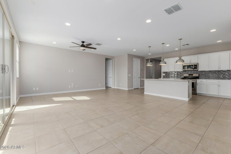 A multi-slider glass door seamlessly connects indoor & outdoor living, leading to a backyard with low-maintenance desert landscaping & a large paver patio, ideal for