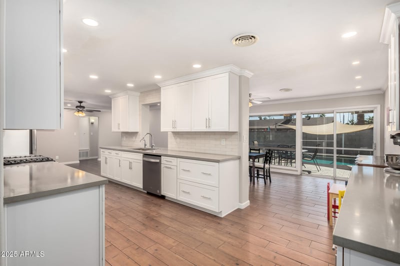 Listing details for 1959 Laguna Dr, Tempe, AZ 85282 : REMODELED - Stunning 5 Bedroom/2 Bath, Single Story, North/South Facing Home in Tempe Royal Palms! Completely Upgraded Home features, Huge Open/Split Floorplan, Master Suite w/2 Walk-In Closets, 4 Additional Oversized Bedrooms, Large Living Room w/Wood Burning Fireplace, Additional Living Area w/Large Dining & Bonus Space. Completely Remodeled Kitchen w/Stainless Appliances, Quartz Counters & Beautiful Cabinetry (2024), Roof w/Warranty (2022), 5 Ton TRANE AC (2017) Electrical Panel (2021), Artificial Turf Back Lawn (2024), Insulated Garage w/Mini Split AC Unit (2020), New RV Gate (2022), Tankless Water Heater (2020) Lush Resurfaced Pebbletec Pool (2020) Pool Pump (2021) Solar Child Safety Pool Cover (2021) Spacious 112 Sq. Ft. Workshop/Studio. NO HOA, Super Low Maintenance Property!
