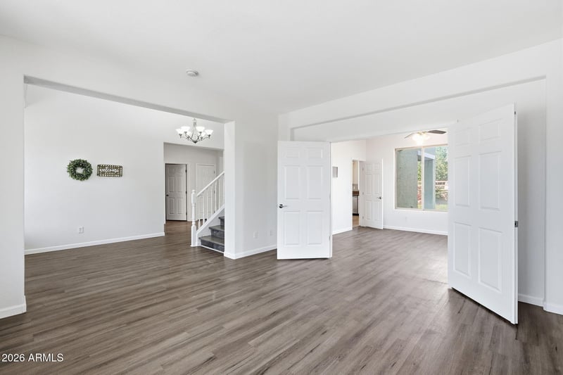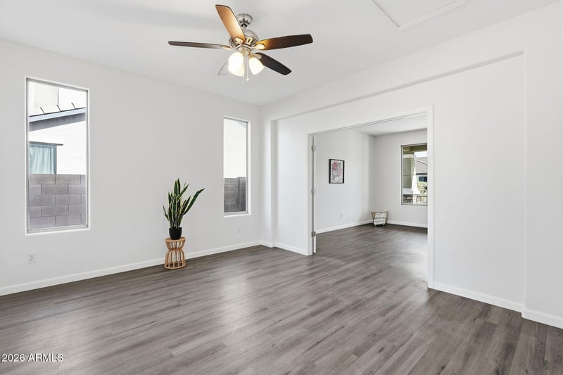 Listing details for 19636 189th St, Queen Creek, AZ 85142 : This updated 2-story home blends comfort and style with wood-look floors and a soft, neutral palette throughout. A front den offers the perfect spot for a home office or reading nook. The open great room features a fireplace and connects to a bright kitchen with stainless steel appliances, white cabinets, granite counters, tile backsplash, and a central island. Upstairs, the primary suite includes a private balcony, modern bath with dual sinks, soaking tub, barn door, and walk-in closet. Two bonus rooms provide space for a gym, studio, or media setup. The backyard features a covered patio and plenty of room to make your own.