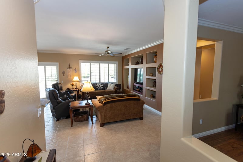 Listing details for 19704 Canyon Whisper Dr, Surprise, AZ 85387 : This is a must see home! Shutters have been added to all windows as well as crown molding throughout!! Tile and laminate flooring walk you through this beautiful home. As you enter, you'll find an open den than a large open kitchen with plenty of counter space and dining area. The living area is open for entertaining. The master bedroom is good size with a bathroom that has double sinks and a step in shower. Large drawers have been added to the master walk in closet. Outside you'll find a covered patio and well maintained backyard with an added water feature!! More pictures soon!