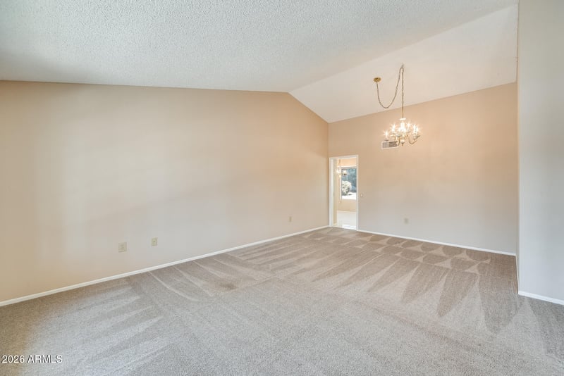 The primary bedroom is generously sized and features vaulted ceilings, soft natural lighting, and ample space for a full bedroom suite. The attached bathroom includes a walk-in shower and convenient layout designed for comfort and functionality.