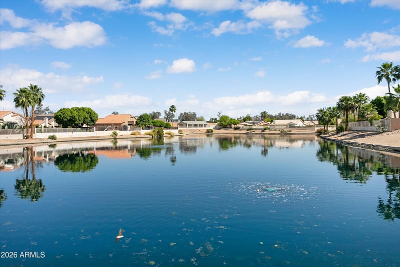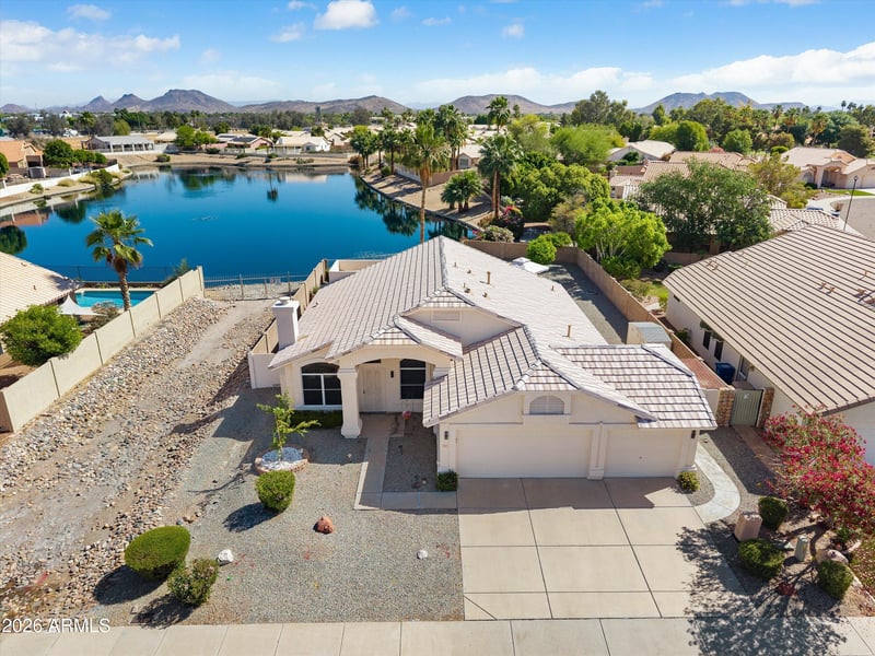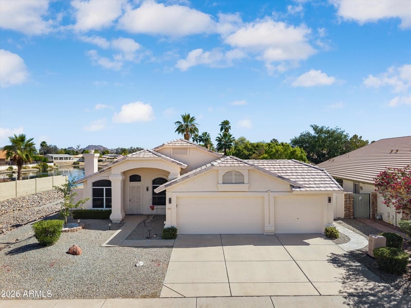 Listing details for 19911 78th Ln, Glendale, AZ 85308 : Lakefront Views from this private lot located in desirable Arrowhead Ranch! Close to shopping, dining, freeways, TSMC. Charming 4 bedroom home features a fireplace, kitchen with Corian counters, central island and bay windows overlooking blue water. Step out to spacious yard with covered patio, pergola and artificial turf for easy care and shady evenings with lake views. Primary suite has a large walk in closet, separate shower and tub, dual vanities and a separate exit to the patio. White blinds throughout, reverse osmosis and water softener, 3 car garage with storage cabinets and a storage shed. WELCOME HOME!