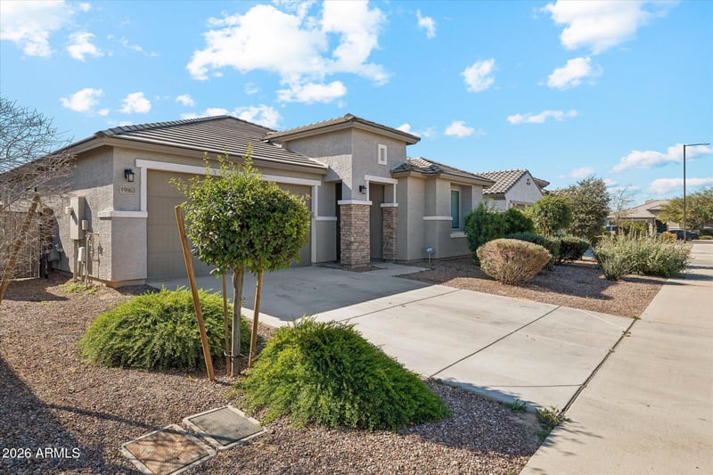 Listing details for 19963 Buchanan St, Buckeye, AZ 85326 : This popular open-concept design features a spacious great room, lots of natural light and tile in all the living areas. The upgraded kitchen consists of granite counters, large island, and abundant cabinetry--ideal for entertaining. The split floorplan and rare third full bath provide flexibility for guests or multigenerational living. The private primary suite includes dual vanities, walk-in rain fall shower with bench seating, and large closet. Enjoy the low-maintenance backyard with covered patio and turf area perfect for relaxing or pets. Energy-efficient construction, dual pane windows, smart home features, and Lennar's popular ''Everything's Included'' upgrades. PLUS a prime location near parks, schools, future retail and easy I-10 access make this home a standout opportunity.