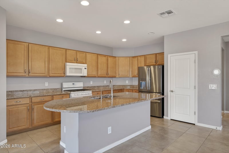 Listing details for 19966 Sherman St, Buckeye, AZ 85326 : Welcome to a beautifully maintained, move in ready home set on a desirable corner lot. This inviting residence offers three bedrooms, a den, and two baths within a spacious 1820 square foot layout designed around an open great room concept. The upgraded kitchen showcases granite countertops, a generous island with seating, and a convenient pantry. From the great room, sliding glass doors open to a covered patio and an extended paver patio enhanced by a pergola and an outdoor island with counter seating. The expansive backyard features low maintenance desert landscaping and provides ample space should you wish to add a pool. The primary bedroom includes direct access to the backyard along with a private bath featuring a dual sink vanity, separate tub and shower, and a walk-in closet. Additional highlights include two tone paint, tile flooring throughout, and a two-car garage.