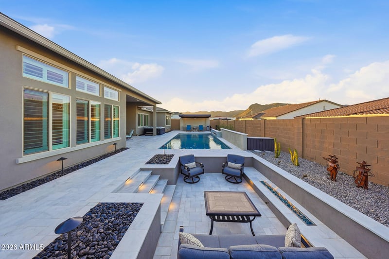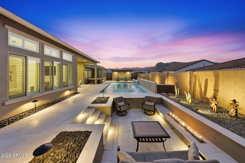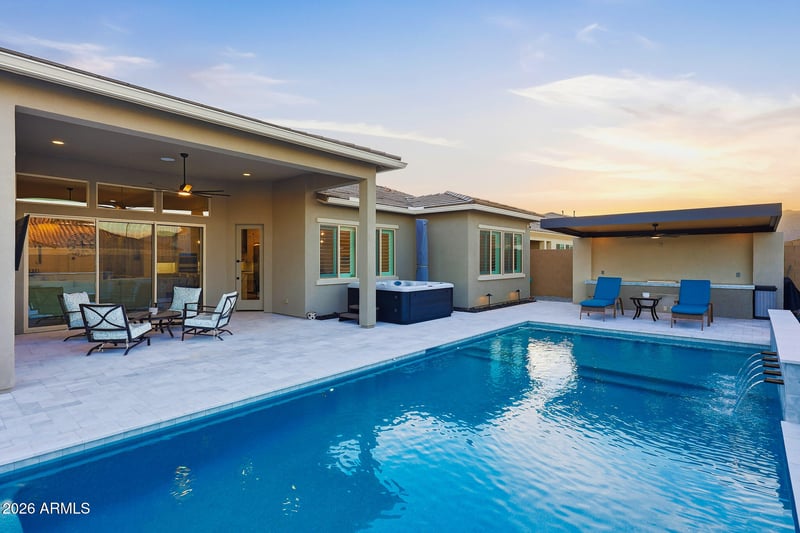 Listing details for 19978 Luke Ave, Litchfield Park, AZ 85340 : Impeccably upgraded David Weekley home featuring an RV garage and a resort-style backyard, thoughtfully designed and meticulously maintained to reflect true pride of ownership. The heart of the home is the gourmet kitchen, showcasing a stunning waterfall-edge island, professional-grade Monogram appliances, double wall ovens, pot filler, and a built-in Thermador wine refrigerator, ideal for both everyday living and entertaining. The luxurious primary suite offers soaring 12-foot ceilings, an expansive walk-in shower with multi-shower heads including rain head, and an oversized walk-in closet, creating a serene private retreat. Wood-look tile in an elegant herringbone pattern flows throughout the home, adding warmth and timeless style. Additional living spaces include a private guest suite with ensuite bath and kitchenette, two secondary bedrooms connected by a Jack-and-Jill bathroom, and a dedicated office or den. The oversized three-car tandem garage and impressive 50-foot RV garage with epoxy floors are true standout features, offering exceptional storage and flexibility. Outdoor living is elevated with a sunken fire pit, above-ground spa, custom cantilever shade structure, travertine hardscape, and permanent holiday lighting - perfect for year-round enjoyment. Schedule your private tour today and discover the best Canyon Views has to offer.