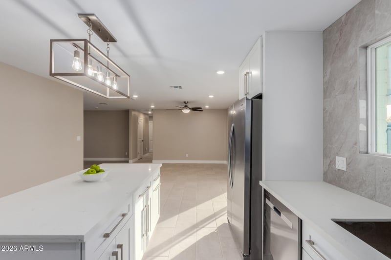Listing details for 2 130th Pl, Chandler, AZ 85225 : This thoughtfully updated 3-bedroom home welcomes you w/ a 2-car garage & RV gates for convenience. You'll be delighted by the renovated interior, boasting a spacious open layout w/ a soothing palette, blinds, & durable tile flooring. The upgraded kitchen comes w/ sleek quartz counters, white shaker cabinets, a striking tile backsplash, stainless steel appliances, & an island w/ a breakfast bar. The primary bedroom showcases sliding door access to the backyard for seamless indoor-outdoor living, a private bathroom, & a walk-in closet. Spend enchanting evenings in the sizeable backyard, featuring a covered patio, stylish pavers, & pristine artificial turf. The City of Chandler has approved up to 3 Additional Dwelling Units for use on the property. It's the largest lot in the subdivision! Also, the City of Chandler has approved up to 3 Additional Dwelling Units for use on the property.
