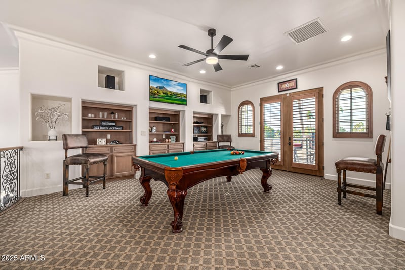 The game and billiards loft features a wet bar, powder bath, bench seating for fun gatherings, and features the crowning glory of patios with unmatched sunset views over the lake.