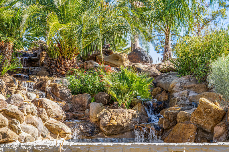 This estate is designed for the ultimate Arizona lifestyle, with a massive retractable glass wall that merges the great room seamlessly with the resort-style backyard. Situated on a premium acre-plus lot, the outdoor oasis offers stunning views of the community's private lake and wandering streams as well as expansive golf course views from the elevated poolside viewing patio. The terraced grounds feature a custom pool with beach entry, lanai, mosaic-tile slide, a raised spillover spa, multiple stone-clad fireplaces, massive patio-side rock waterfall, putting green, and a rotunda-style outdoor kitchen perfect for weekend BBQ's.