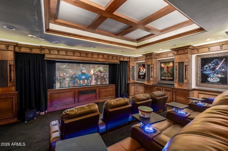 Retreat to the basement via the spiral staircase and enjoy your favorite movies in a state-of-the-art private theater that calls back to the glory days of Hollywood glamour. The theater is ensconsed in rich woodwork and acoustic walls, and features Dolby surround, custom lighting scenes, tiered reclining seats with snack trays, a popcorn machine and beverage fridge, a full bath, and a tech closet, ensuring a premium cinematic experience without leaving the estate.
