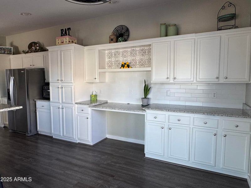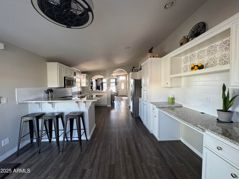 Listing details for 2000 Apache Rd #156, Buckeye, AZ 85326 : Come see this immaculate manufactured home in Buena Vista mobile home park. Featuring an open floor plan with a huge spacious eat in kitchen, modern cabinetry, granite countertops, French doors leading to a sitting area on a quite covered patio. Large living area with natural light, split floor plan with master suite complete with large bathroom, walk in shower, separate toilet room. Large laundry room with stackable washer and dryer with separate exit door. Updated flooring, newer roof, newer A/C and new automatic watering system for the landscaping. Covered parking spaces, sunshades on all windows, covered patio for enjoying the beautiful Arizona mornings. Very large corner lot with great views of the mountains.