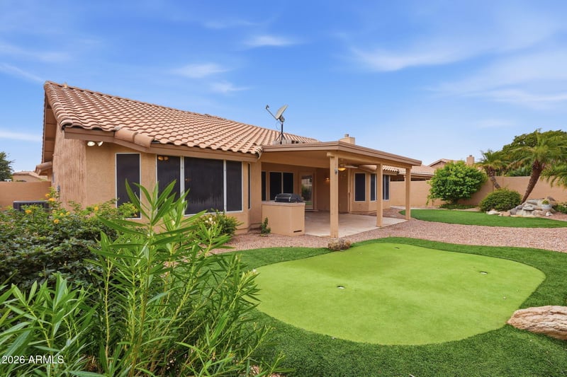 Listing details for 20001 86th Dr, Peoria, AZ 85382 : Stunning fully remodeled 2-bedroom/2-bath home complete with 3-car garage and a private lot backing to wash! Popular Camelback model with vaulted ceilings, newly painted interior with luxury vinyl plank flooring offers two living areas ideal for entertaining and everyday living. The chef's kitchen features new white shaker cabinetry stainless steel built-in appliances including gas range, quartz counters with herringbone tiled backsplash and a breakfast bar. Check out the primary bedroom with access to patio plus double closets and a private bathroom with dual sinks, quartz counters and walk in shower. The backyard includes a covered patio, built-in BBQ and putting green perfect for unwinding or hosting lively weekend gatherings. Don't let this amazing house in Westbrook Village slip by!