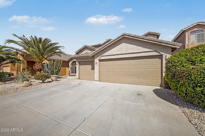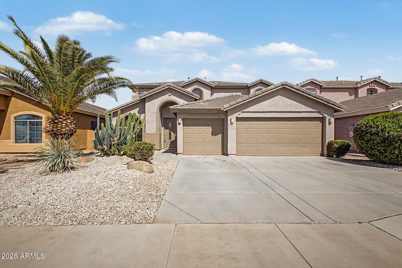 Listing details for 20037 Santa Cruz Dr, Maricopa, AZ 85138 : Beautiful 5 bedroom, 3 bath home located in the very desirable community of the villages at rancho el dorado. With almost 3200sf of well appointed living space this home features a formal living/dining room, family room, downstairs guest bedroom with full bath and a chef inspired kitchen with double wall ovens, gas range and granite counter tops. Upstairs you will find an additional 3 guest bedrooms two with walk in closets, guest bath with double sinks and a large primary bedroom with en suite featuring two vanity areas and a jetted garden tub. Low maintenance backyard with view fencing, new artificial turf and large patio. Fresh interior paint and a 3 car garage. Community features two swimming pools, fitness center, sports courts and many parks and walking paths.