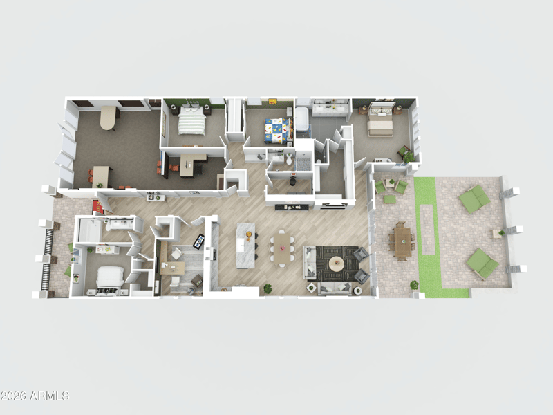Listing details for 20045 229th Way, Queen Creek, AZ 85142 : Welcome to this stunning furnished model home featuring the Acacia floorplan with 4 bedrooms, 3 bathrooms, an office, and a 3 car tandem garage. Thoughtfully designed with premium upgrades, designer accents, and elegant shutters throughout. The inviting great room showcases a sleek electric fireplace and center open sliding door, while the gourmet kitchen impresses with built-in stainless steel appliances, granite countertops, and an expansive island with breakfast bar. The primary suite features a tray ceiling and a lavish ensuite with a framed mirror, dual sinks, and a separate shower and soaking tub. Enjoy a beautifully professionally landscaped backyard complete with an elevated planter. Included in this home: tankless water heater, energy-efficient HVAC, two-tone paint, brick paver driveway, R/O Loop, Soft Water Loop, and ceiling fans.