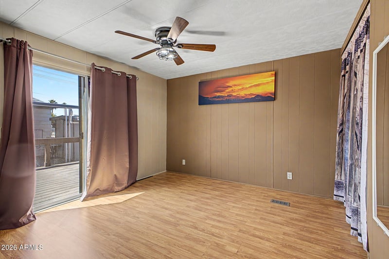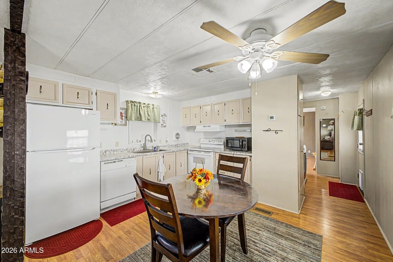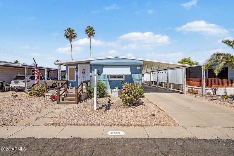 Listing details for 201 Greenfield Rd #291, Mesa, AZ 85206 : Charming manufactured home in the desirable 55+ Hacienda De Valencia community in Mesa. Roof replaced in 2025 and AC in 2023 -- with no carpet: beautiful wood-look laminate floors throughout. Bright open kitchen offers ample storage and flows to a spacious great room. Enclosed Arizona room now serves as a cozy sitting area and opens to a private outdoor deck. Large primary bedroom with generous closet space and a roomy bathroom. Second bedroom plus a convenient half bath--ideal for guests. Pet-friendly (up to 3 pets, no breed restrictions). Community amenities include 2 pools, spas, shuffleboard, dog parks and more. Convenient to dining and entertainment--turnkey living in a vibrant 55+ park.