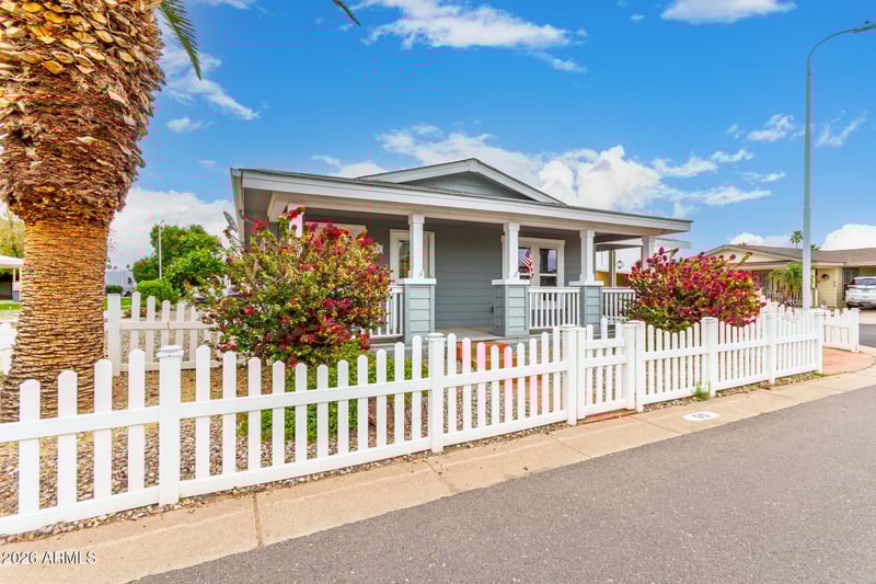 Listing details for 201 Greenfield Rd #90, Mesa, AZ 85206 : Seize the chance to own this charming 2-bedroom home in the adult Community of Arizona Citrus Groves! You're welcomed by a lovely picket fence and a front porch perfect for enjoying morning coffee on a great corner lot. Inside, you'll find a cozy living room with vaulted ceilings, and very attractive wood-look flooring. The well-appointed kitchen comes with ample wood cabinets with crown moulding, recessed lighting, essential built-in appliances, and a two-tier peninsula with a breakfast bar for casual meals. The primary bedroom features a versatile sitting room, backyard access, a private bathroom with dual sinks, and a walk-in closet. Enjoy peaceful outdoor moments in the backyard, which offers a covered patio ideal for dining al fresco. The community offers a large clubhouse for hosting social events, a fitness center, shuffleboard courts, community heated swimming pool and so much more to enjoy the active adult living style. Don't miss this one!