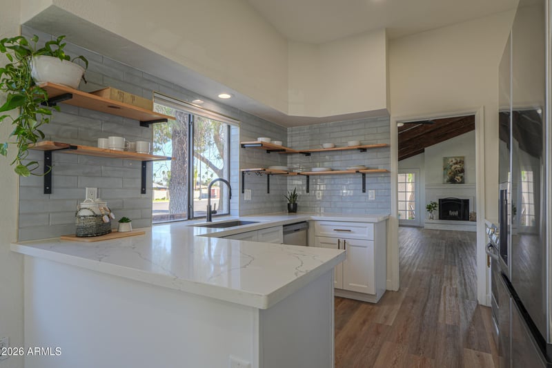 Listing details for 2011 Nopal Ave, Mesa, AZ 85202 : Welcome to this beautifully updated 3-bedroom, 2-bath single-level home in the heart of Dobson Ranch. Offering 1,798 sq ft of thoughtfully designed living space. Recent upgrades include a new roof, new AC, new front turf, and stylish interior enhancements throughout. The remodeled kitchen shines with new countertops, updated cabinetry, and modern floating shelves, seamlessly opening to the main living areas. Vaulted ceilings and a cozy fireplace add warmth and character, while updated flooring and baths elevate the home's modern appeal. Enjoy low-maintenance outdoor living and access to community amenities including pools, walking paths, and greenbelts—all in a prime Mesa location near shopping, dining, and freeways.