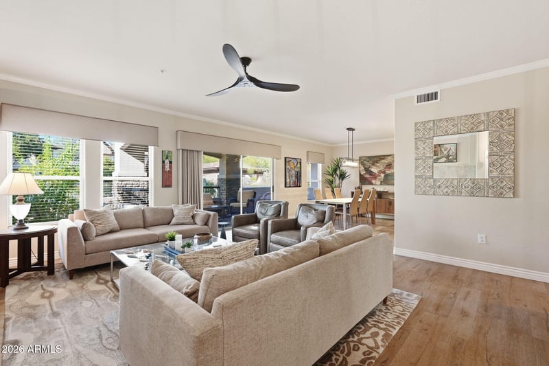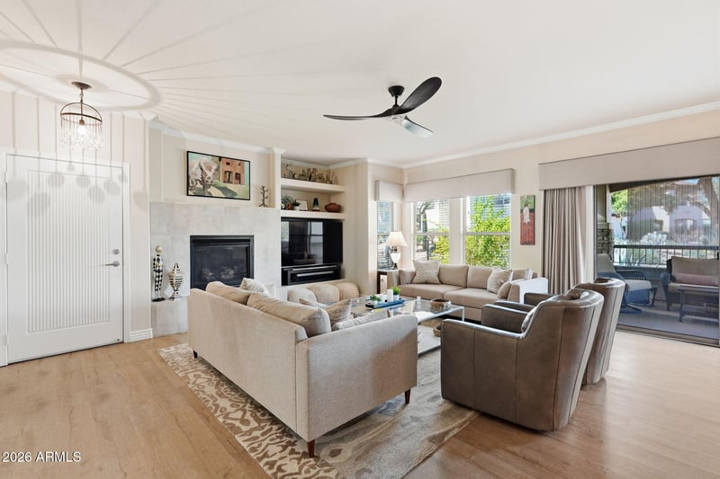 Listing details for 20121 76th St #1052, Scottsdale, AZ 85255 : Gorgeous ground floor 3-bed, 2-bath w/attached 2-car garage (not tandem) & an outstanding location overlooking the peaceful community commons, just a short walk to the pool & fitness room. Enjoy the open floor plan w/no steps, a large outdoor patio, a spacious living area w/a gas fireplace & a large dining area, both open to the kitchen. Remodeled kitchen w/white granite waterfall countertops, a gas range, newer appliances & premium plank flooring. The home includes a large primary bedroom w/built-in cabinets, ample closet space & a spacious bathroom. Remaining bedrooms are split from the primary & feature a common bath, granite counters & newer hardware. Includes a front security storm door (w/glass or screens), interior laundry room w/washer & dryer and a new 2025 Trane HVAC system. The Vintage at Grayhawk is in a prime north central Scottdale location, just a short drive to HWY 101 and Scottsdale Rd, hospitals (including The Mayo Clinic, Honor Health Thompson Peak and soon-to-be Banner Hospital), grocery stores, lush golf courses like Grayhawk and The TPC, as well as numerous local restaurants and luxury shopping at Kierland Commons, The Scottsdale Quarter, Desert Ridge and many new nearby destinations on the horizon!