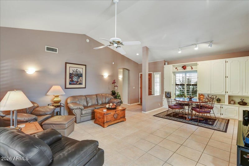 Listing details for 20126 92nd Ave, Peoria, AZ 85382 : Upon entry you're greeted by a Spacious Living/Dining Room w/Vaulted ceilings, built in cabinetry for multiple things i.e. games, artistic projects, 4'' wood Shutters, 16x16 TILE Floors THROUGHOUT. It seamlessly Connects with the Lge Family Room which is open to the Kitchen w/updated cabinetry, Newer BLK Stainless Steel Appliances, solar Tube for added lighting, large pantry & Built-in desk w/drawers & cabinets galore! Two Generous size Bedrooms boasts plenty of space, both w/walk in closets. Primary bedroom Suite has Garden tub, shower & private toilet room, double sinks & separate entrance to backyard. AMAZINGLY Beautiful ''Gardeners Delight'' South / West Backing yard w/extended tiled, covered patio to entertain or simply enjoy your days. 2 car garage w/golf cart ramp & keyless pad Whether you're looking for your Winter getaway or Full-time Residence this house has the bones & opportunity to make it the home of your dreams. Fabulous Community that offers MANY Amenities, 2 Golf Courses, 2 Recreation Centers & 2 on-site Restaurants.