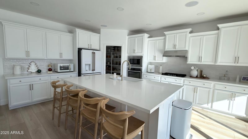 kitchen is a culinary haven, with a prep island and a breakfast bar. The property includes an upgraded kitchen with Quartz countertops and backsplash, a pantry, and