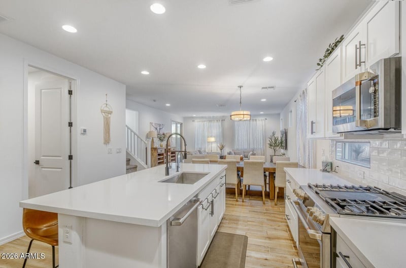 Listing details for 20228 Campbell Ave, Litchfield Park, AZ 85340 : Almost new home with nothing to do but move in and enjoy the beautiful community. When you walk in the door there is a good size office that could easily be converted to a bedroom. The immaculate and spacious kitchen has top of the line appliances, quartz counter tops, huge kitchen island and walk in pantry. The kitchen is open up to the living room which makes it great for entertaining. Downstairs is a bedroom and full bathroom which could be used for people whom don't like to climb stairs. Upstairs is the primary bedroom and a magnificent primary bathroom. The huge walk in shower makes it feel like resort living. The upstairs loft is a great area for entertaining and just relaxing & watching tv. The other upstairs bedrooms have their own hall bathroom. When you look out on the 2nd level there is a gorgeous view, of the White Tank Mountains and desert. The backyard has a putting green and covered patio to enjoy outdoor living. The Living Spaces and Potato Barn Furniture is for sale $40,000 and Golf Cart in garage for $13,000 on a separate bill of sale. This home is located close to shopping, restaurants, grocery stores in the growing are Verrado.