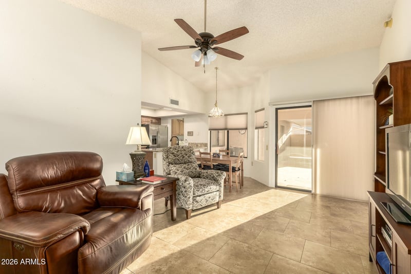 Listing details for 20241 Broken Arrow Dr, Sun City West, AZ 85375 : Welcome to this charming 2-bedroom patio home in the 55+ Sun City West! The inviting interior features plantation shutters, abundant natural light, vaulted ceilings, neutral palette, and tile & soft carpet throughout. Excellent floor plan showcasing a combined living & dining room, along with a separate family room! The impressive kitchen boasts SS appliances, granite counters/backsplash, recessed lighting, a breakfast nook, & a peninsula w/breakfast bar. The main bedroom has sliding doors to the back and an ensuite with dual vanities & a walk-in closet. Laundry room with cabinetry. If you want to relax or enjoy BBQ, the private backyard awaits! A covered patio , well-laid travertine, & artificial turf complete the picture. Also including access to the attached 1-car garage. Make it yours