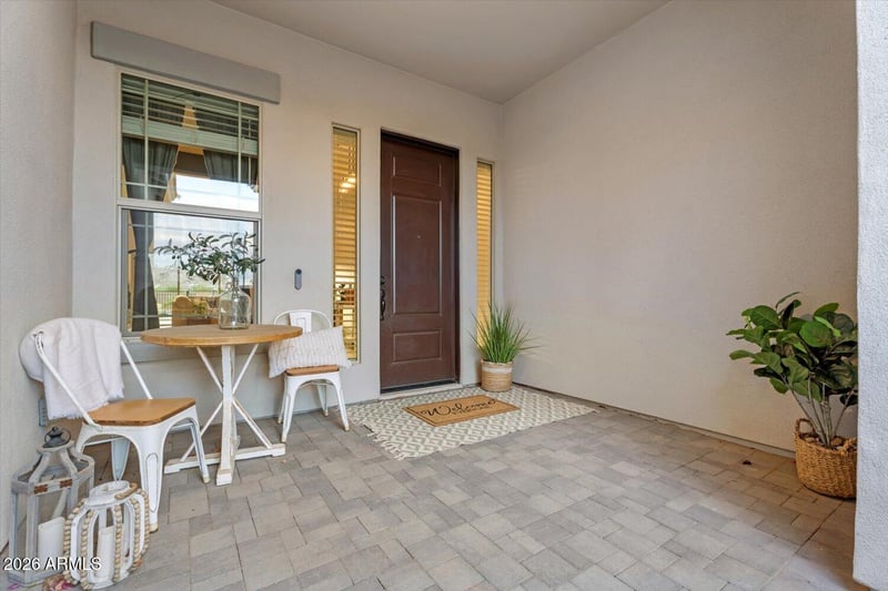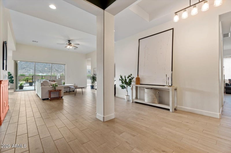 A private gated courtyard creates a grand sense of arrival, leading into an elegant interior defined by soaring 12' ceilings, wood-look plank tile, and expansive windows that flood the home with natural light and Stunning Mountain Views. The open-concept floor plan features 4 bedrooms, 3 full bathrooms, and two versatile flex spaces ideal for a private office, media lounge, or bespoke lifestyle needs.